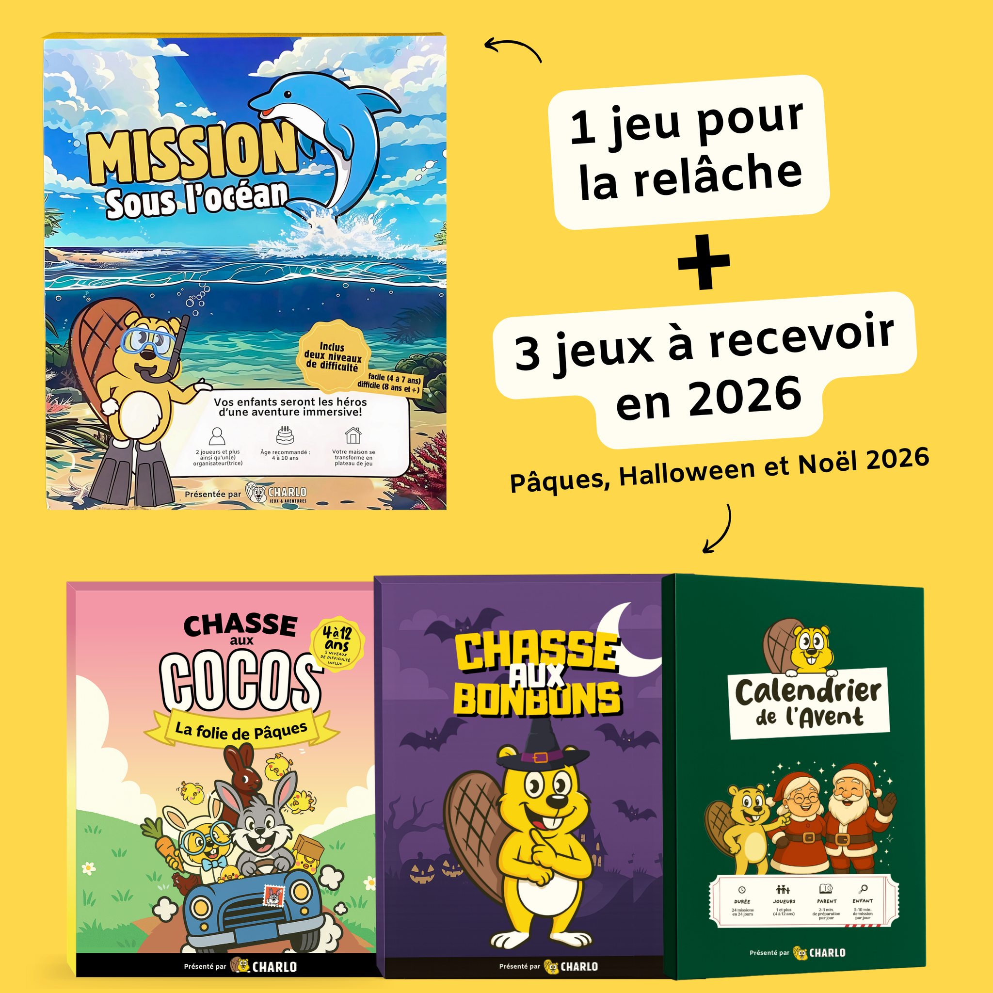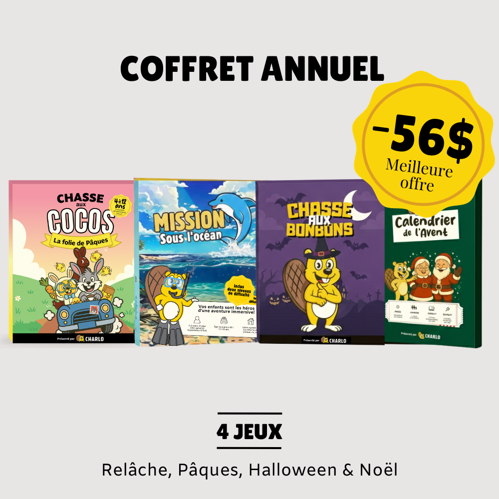 Le Coffret annuel Charlojeu vous offre 4 jeux éducatifs thématiques livrés aux moments parfaits de l'année pour créer des souvenirs inoubliables en famille. Chaque jeu est conçu pour célébrer une période spéciale et offrir des heures de plaisir et d'apprentissage.
